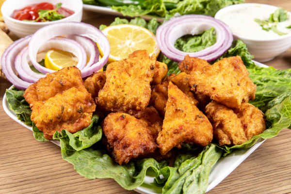 Fish marinated in lemon juice, garlic, chickpea flour, and spices.